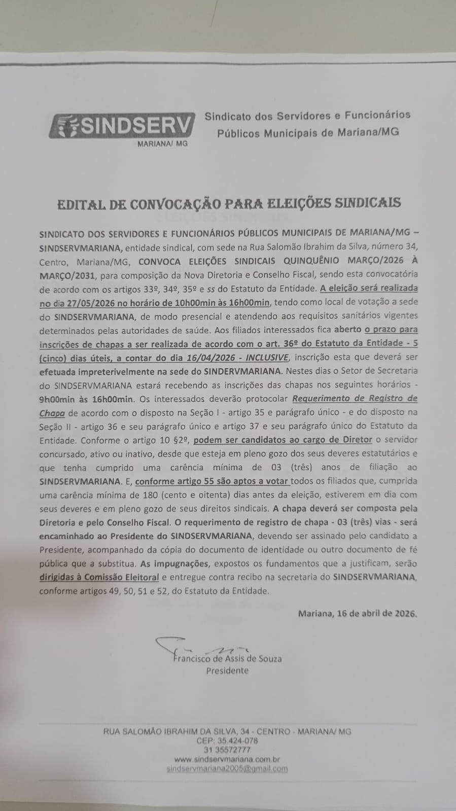 O Sindicato dos Servidores e Funcionários Públicos Municipais de Mariana/MG (SINDSERV Mariana) publicou edital de convocação para as eleições sindicais que irão definir a nova Diretoria e o Conselho Fiscal para o quinquênio de março de 2026 a março de 2031.