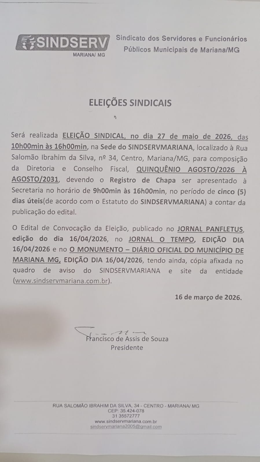 De acordo com o edital, a eleição será realizada no dia 27 de maio de 2026, na sede do sindicato, em Mariana, no horário das 10h às 16h, de forma presencial e em conformidade com as normas sanitárias vigentes.