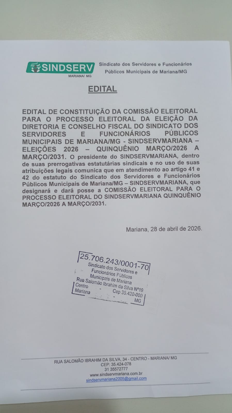 O Sindicato dos Servidores e Funcionários Públicos Municipais de Mariana (SINDSERVMARIANA) publicou o edital que inicia o processo eleitoral para a escolha da nova diretoria e do conselho fiscal.